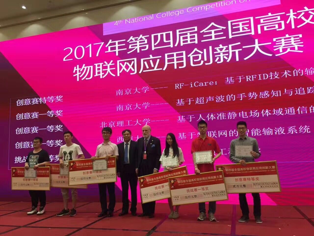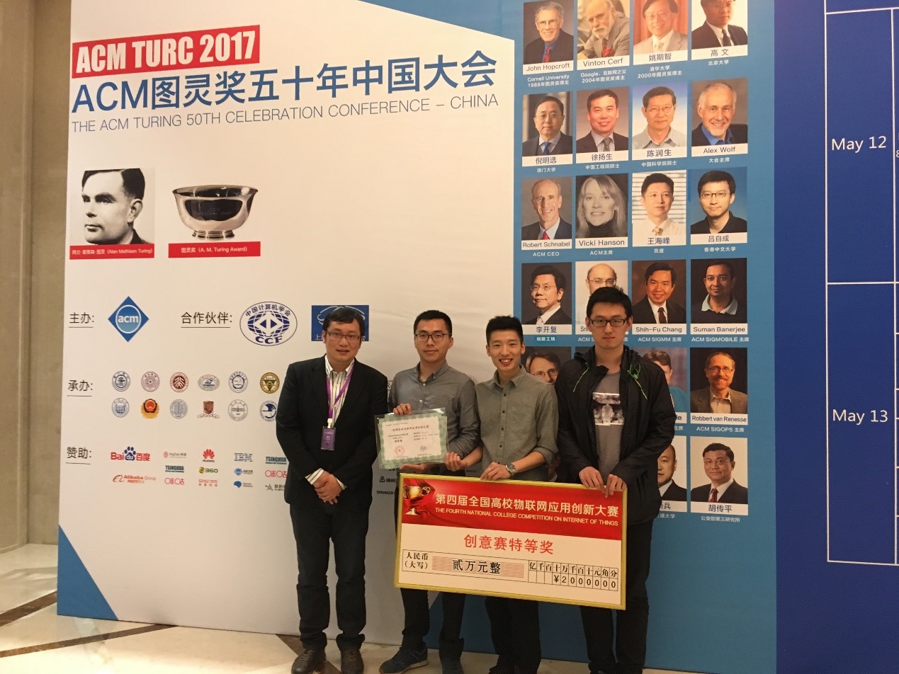 2017年5月12 – 14日,由教育部科技发展中心主办的第四届全国高校物联网应用创新大赛创意赛全国总决赛在东华大学图文信息大楼第一报告厅成功举办。我系分布式计算团队(成员:何兵兵,张柯岩,陆逸嘉;指导教师:谢磊)凭借“RF-iCare:基于RFID技术的输液监测系统”,从全国七大赛区1050只队伍中脱颖而出,获得第1名的优异成绩,夺得创意赛全国特等奖。我系团队(成员:孙珂、凌康;指导教师:戴海鹏)凭借“基于超声波的手势感知与追踪”的项目夺得总决赛第2名和一等奖(其中特等奖一名,一等奖三名,二等奖六名)。谢磊和戴海鹏作为团队指导教师分别获得最佳指导教师奖。在ACM图灵奖五十年中国大会的庆功晚宴暨赛事颁奖典礼上,图灵奖获得者、互联网之父Vinton Cerf和教育部科技发展中心李志民主任参与颁奖典礼,并颁发特等奖和最佳指导老师奖奖牌。出席者还包括图灵奖获得者John Hopcroft,ACM主席Vicki Hanson,ACM Fellow、IEEE Fellow、清华大学软件星际娱乐城 院长刘云浩等。此次总决赛的参赛队伍共有从七大赛区选拔出来的包括星际娱乐城 、清华大学、武汉大学、哈尔滨工业大学、华中科技大学、西安交通大学等在内的42所高校75支参赛队伍。