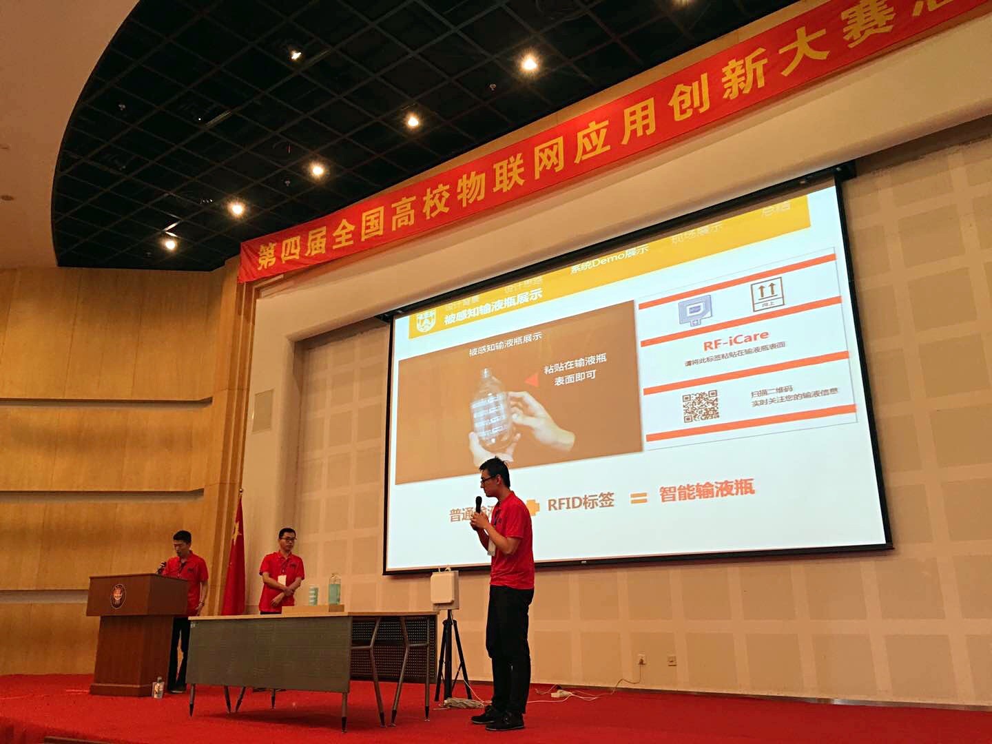 我系分布式计算团队的项目“RF-iCare:基于RFID技术的输液监测系统”,利用RFID的信号强度和相位数据,结合了RFID信号被液体影响的规律特征,设计高效算法实现了1cm精度的水位高度检测,是国内首例基于RFID无源感知技术实现非接触水位监测的研究成果。该研究成果只需要在容器表面粘贴上RFID标签贴纸,既可以实时监测容器的水位高度。在比赛现场,分布式计算团队在输液瓶、玻璃水杯、塑料水杯、饮料瓶表面粘贴“尔福康贴纸”,展示高精度、高实时性的现场水位监测效果,新颖的交互方式将现场气氛推至高潮,观众和评委纷纷拿出手机录制,答辩环节更是得到了评委们的关注。最终,分布式计算团队的项目获得创意赛第一名,评为全国总决赛特等奖。