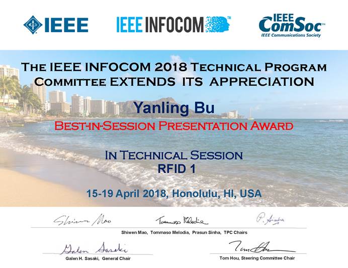 INFOCOM是由IEEE组织的通信网络领域的国际盛会,和MOBICOM和SIGCOMM同为中国计算机学会推荐的计算机网络方向的A类会议,为全球计算机网络领域的学者提供了很好的展示舞台和交流平台。本届INFOCOM共收到来自世界各地的1606篇投稿,录用的正式会议论文共309篇,录用率为19.2%。大会中每个Session产生一个Best-in-Session Presentation Award。该奖项的设立旨在提高论文汇报质量,提升参会者体验,保证会议交流水平。各Session主席邀请至少4个TPC成员到场并为论文汇报人的展示进行严格打分,最后得分最高者获此奖项。