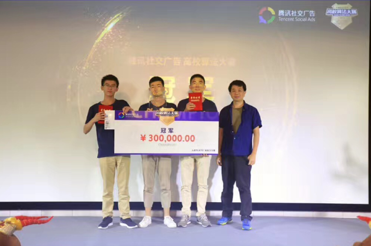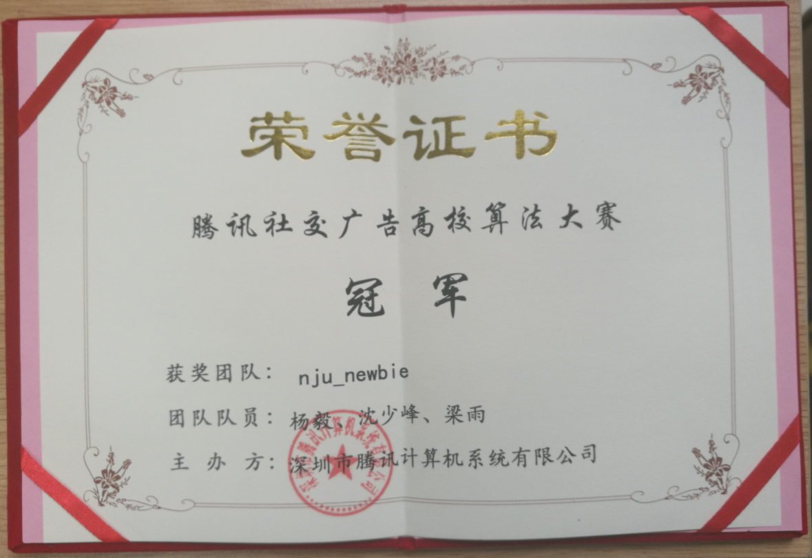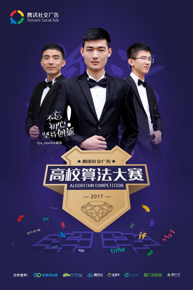 2017年7月6日,首届腾讯社交广告“高校算法大赛”在深圳腾讯大厦举行了现场答辩及颁奖典礼。经过历时近 2 个月的激烈角逐,我系机器人智能与神经计算研究组(//xjylcofficial.com/rinc/index.html)的“nju_newbie”战队(成员:杨毅,沈少峰,梁雨,指导教师:申富饶)以领先优势夺得冠军,获得 30 万奖金。腾讯社交广告总经理罗征为冠军战队颁奖。出席者还包括腾讯公司副总裁林璟骅、腾讯公司副总裁王巨宏女士、腾讯社交广告质量研发中心总监靳志辉、精准推荐中心总监肖磊、腾讯云技术总监黄希彤、商业数据产品中心总监管琰平以及新加坡资讯通信研究院数据分析研究所所长李晓黎。本次比赛吸引了近 18000 名高校学生积极参与,参赛者遍布中国大陆、香港、美国等国家及地区。最终来自星际娱乐城 ,清华大学,北京大学,复旦大学,吉林大学,大连理工大学等高校的全国十强战队在深圳腾讯大厦进行了现场答辩。