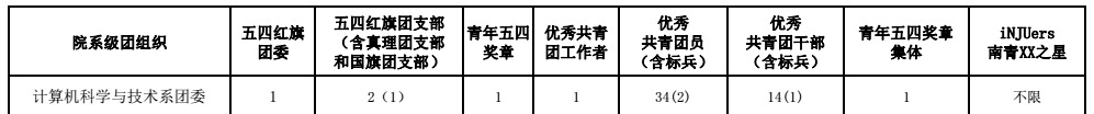 6、优秀共青团干部及标兵(共14个推荐名额,其中标兵1个):(1)本科16级、17级各2人,18级、19级各3人,共计10人;(2)研究生(含硕士、博士)共计2人;(3)团委学生会2人。【注意:团委学生会产生候选人之后请及时告知候选人所在年级总支以免重复推荐】