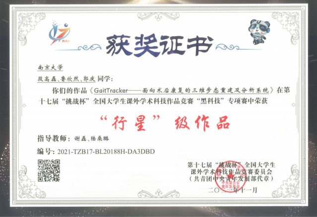 GaitTracker步态分析系统经过我系谢磊教授、陆桑璐教授的悉心指导,由计算机系学子独立设计完成,并不断进行系统的迭代优化,此前凭借创新型的平台已斩获多项系统类的荣誉:在2021年第十七届“挑战杯”全国大学生课外学术科技作品竞赛过程中,取得黑科技专项赛国赛“行星”级作品、江苏省赛特等奖;2021年中国高校计算机大赛-网络技术挑战赛华东赛区一等奖。