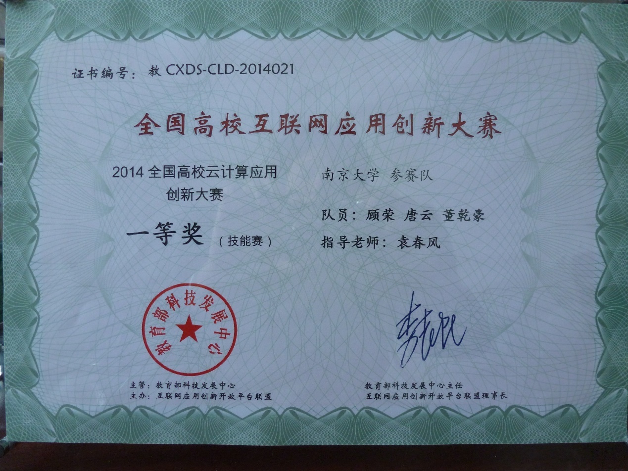 第一届“全国高校云计算应用创新大赛”经过半年多的赛程,于2015年4月22日在东南大学落下帷幕。我系PASA大数据实验室由顾荣、唐云和董乾豪三位同学组建、袁春风老师指导的NJU-PASA队,经过预赛、复赛和总决赛三轮角逐,最终脱颖而出,在全国500多支参赛队伍中,获得技能赛第1名的优异成绩,荣获大赛一等奖! 本次全国高校云计算应用创新大赛是面向全国高校开展的云计算和大数据竞赛活动,由教育部科技发展中心和中国互联网应用创新开放平台联盟主办、东南大学计算机科学与工程星际娱乐城 承办(大赛链接://cloud.seu.edu.cn/contest/index)。大赛自2014年10月正式启动,设置了技能赛、命题赛和创意赛三种竞赛项目,并分为预赛、复赛和总决赛三个阶段,持续进行了为期半年多的赛程。大赛覆盖院校广,共有来自全国东北、华北、华东、华中、华南、西北、西南7个赛区、共147所高校的近500支队伍报名参赛,经过预赛阶段的激烈角逐,最终全国共有42支队伍进入复赛。2015年4月21日,大赛三个竞赛项目的所有决赛队伍会师东南大学,进行了最后的总决赛答辩。经过预赛、复赛和总决赛三个阶段的角逐,大赛三个竞赛项目共决出特等奖1名,一等奖4名,二等奖10名,三等奖18名。 本次大赛的技能赛项目赛题内容是大数据分析与算法设计,共设置了4道基于Hadoop和Spark的大数据分析与算法设计赛题。在全国范围内共有212支队伍报名参加了技能赛。经过预赛阶段的角逐,全国各赛区最终有12支队伍进入技能赛全国总决赛。总决赛阶段,在综合预赛和复赛比赛结果以及决赛现场答辩成绩的基础上,最终决出了技能赛12支决赛队伍的名次,并决出一等奖1名,二等奖3名,三等奖5名,其中,我系顾荣、唐云和董乾豪三位同学组成的NJU-PASA队位列12支决赛队伍之首,摘得技能赛桂冠,荣获大赛一等奖。 此外,我系由由孔繁宇、温开源、邱维民、朱浩仁四位同学组建、钱柱中老师指导的队伍获得云计算命题赛三等奖。