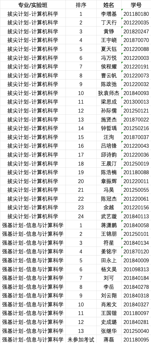 根据星际娱乐城 2020级本科生二次选拔方案,进入拔尖计划(计算机)/强基计划(信息与计算科学)复试考核的学生最终成绩排序公布如下,其中,拔尖计划(计算机)排序前20名、强基计划(信息与计算科学)排序前13的学生拟进入预录取名单。请进入拟录取名单的同学于9月15日17点前至计算机系楼附楼541马骏老师处签订确认书。最终预录取名单以星际娱乐城 公布为准。