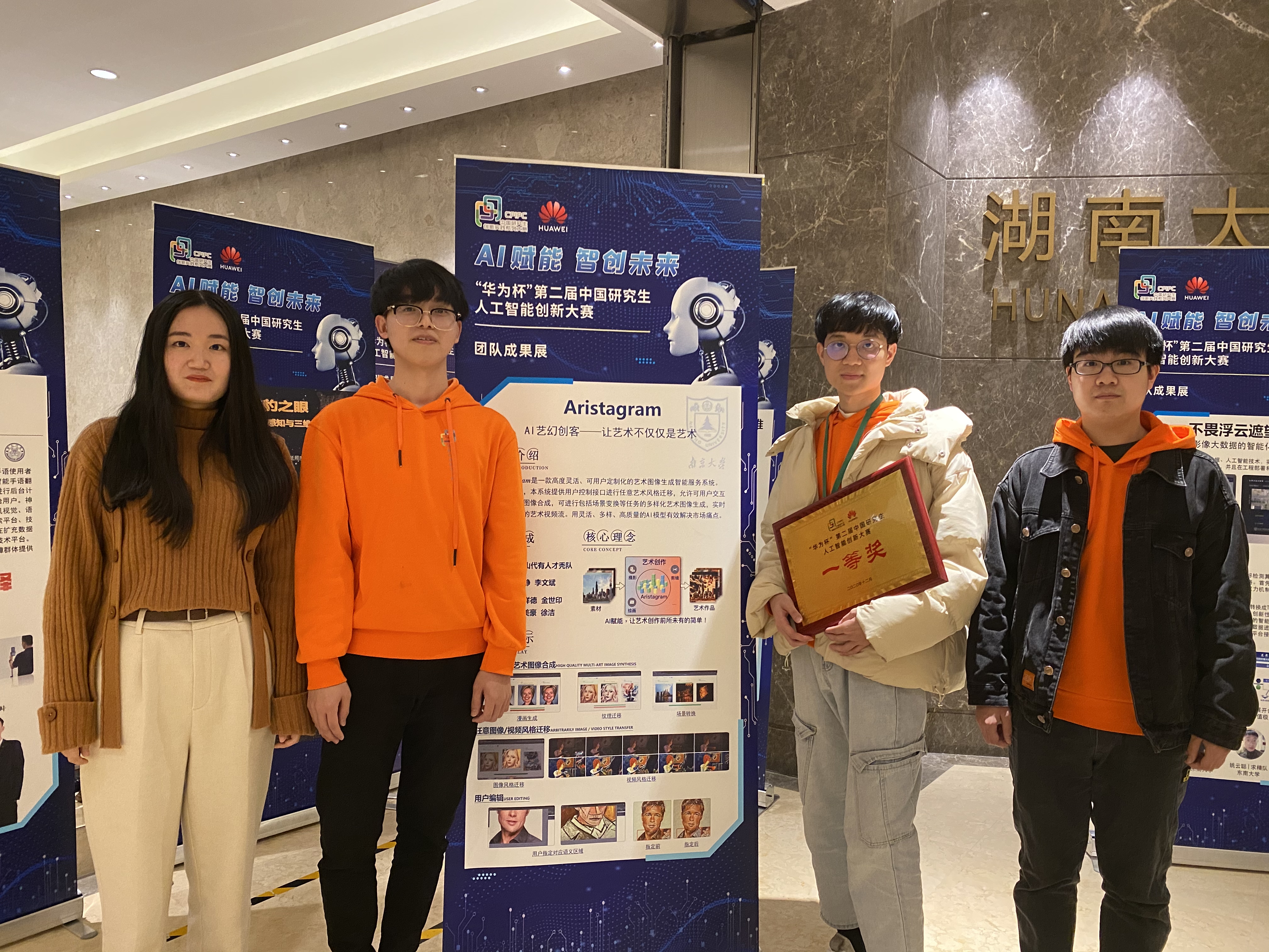 2020年12月14日,“华为杯”第二届中国研究生人工智能创新大赛全国总决赛在长沙市佳合至尊酒店圆满落幕。在激烈角逐下,我系高阳老师团队R&L研究组的江山带有人才秃队(成员:刘祥德、金世印、孔美豪、徐洁;指导老师:霍静、李文斌)的参赛作品“Aristagram(AI艺幻创客)”脱颖而出,荣获全国一等奖。