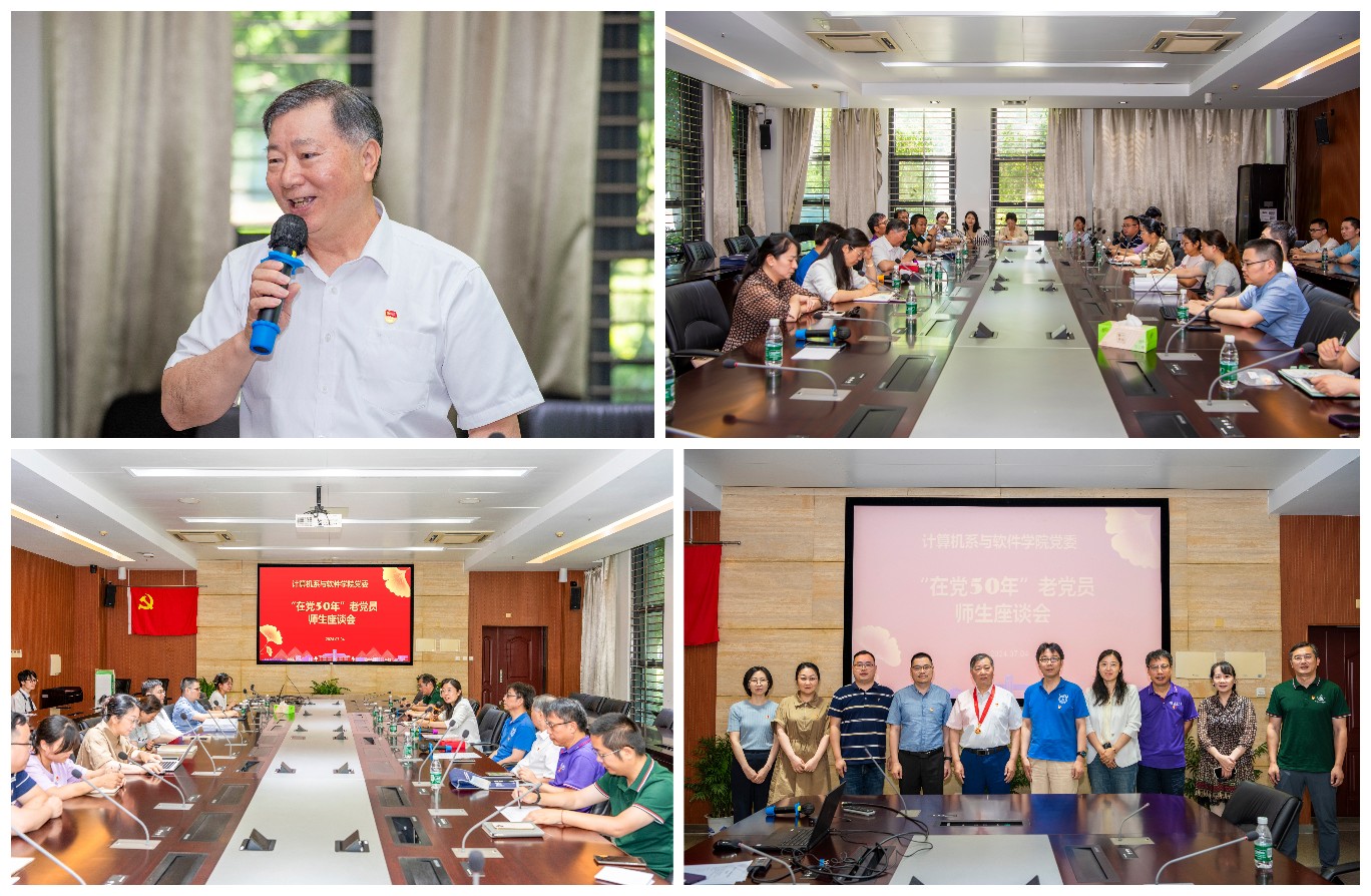 最后,武港山书记代表党委向“光荣在党50年”的潘金贵同志致以崇高的敬意,并对他勤勤恳恳几十载,为党的教育亊业和计算机系的学科发展的辛勤付出和积极贡献表示衷心感谢。武书记说,在党50年是非常光荣的事,也是一件非常的不容易的事情,首先保持思想上在党, 50年思想一直在党不容易;二是保持行动上在党,50年行动上一直和党保持一致不容易;第三是健康在党,50年来保持一个好的身体,持续积极投入工作,做出那么多的贡献,也是不容易。他同时指出,青年师生党员要向老同志们学习,继承发扬前辈们的优良传统,坚定理想信念,志存高远,脚踏实地,潜心做好教书育人工作;学生党员更应牢记初心使命,不断奋斗、努力钻研,为建设科技强国贡献自己的力量,争取每个人都能得到这份“光荣在党50 年”的荣誉。