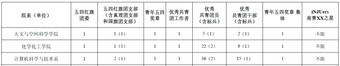 星际娱乐城 团委已发布2018年度五四评优通知,根据文件,我系各类评优可推荐名额为: