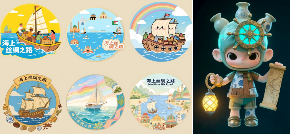 访海上丝绸之路博物馆,千年商路的繁华被一一呈现。青瓷、丝绸、古船模型等展品,承载着海上丝绸之路的悠久历史与文明互鉴的记忆。讲解员从汉代海上陶瓷之路娓娓道来,一直讲到如今的“一带一路”倡议,让队员们明白文化交流对乡村经济的带动作用——古代丝路让瓷器茶叶走出乡村,今天要让红色文化与乡土特产通过现代丝路走向全国。参观时,实践团恰逢当地少先队员,大学生们用通俗易懂的语言为小朋友讲解古代造船技术,小朋友们则声情并茂地描绘自己眼中的海上丝绸之路,不同年龄段的交流碰撞出独特火花。实践团还利用工具设计多款戚继光IP形象及主题系列表情包,巧妙融合英雄精神与丝路文明。