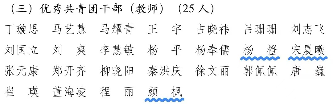 颜枫、宋晨曦、杨橙三位老师获评“优秀共青团干部”,他们扎根团学工作一线,耐心指导青年学生成长成才,用心用情服务团员青年,在思想引领、组织建设、活动开展中主动作为,为星际娱乐城