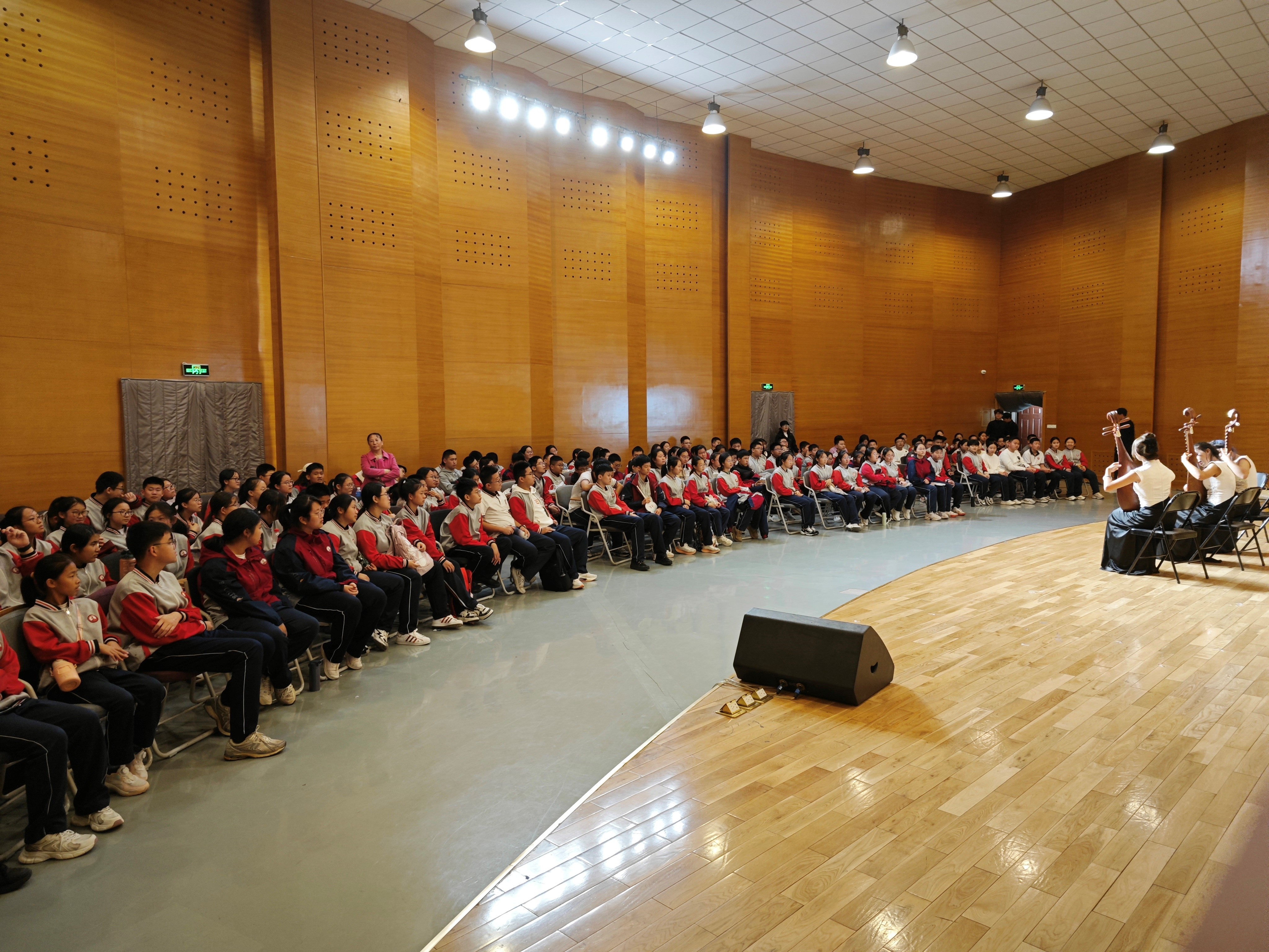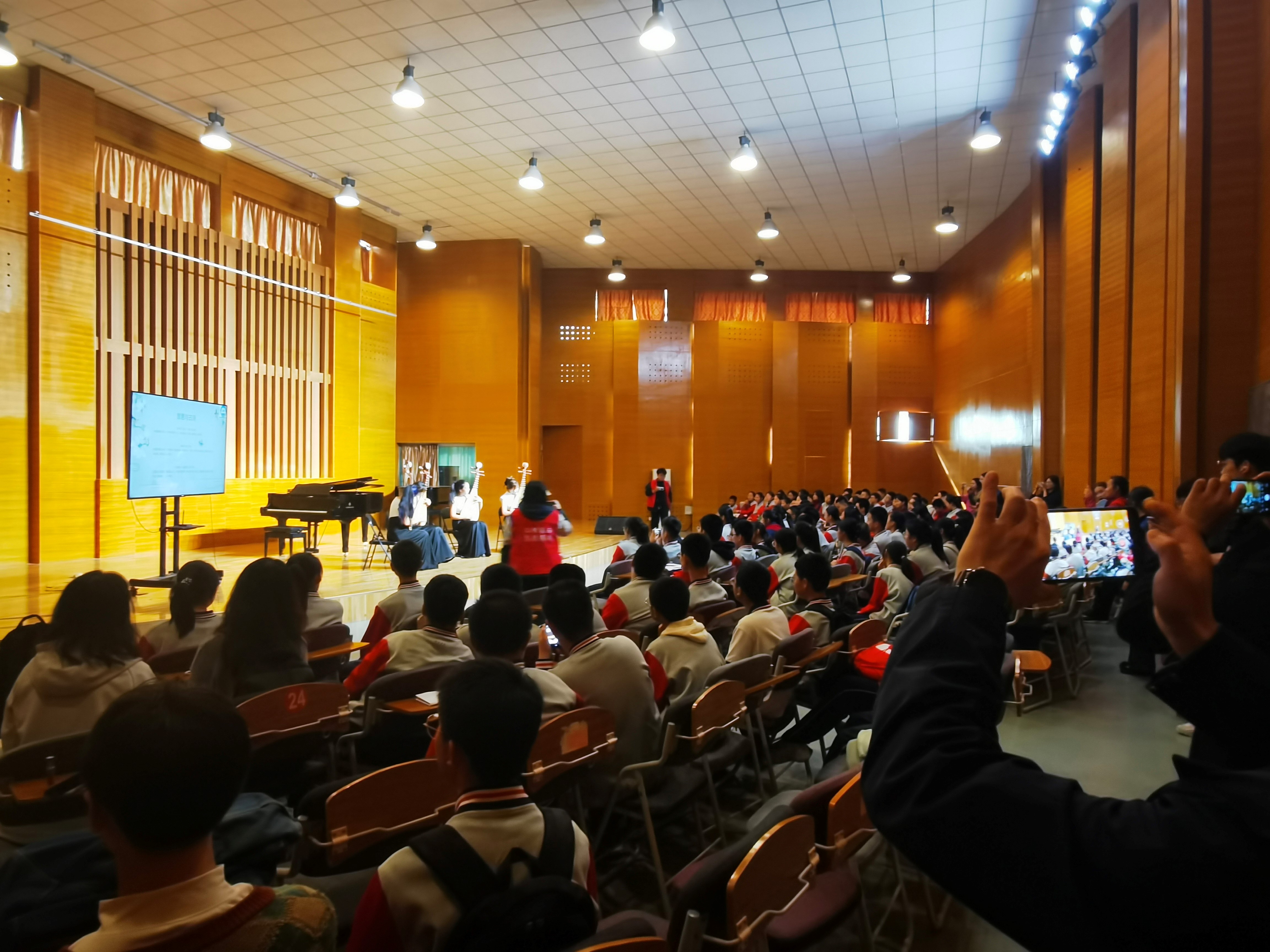 活动第二阶段,在艺术中心音乐厅,学生们沉浸于精彩的音乐盛宴之中,深入了解中国传统乐器,欣赏传统音乐,认识了琵琶、二胡、竹笛等乐器,欣赏了《胶东秧歌风》、《二泉映月》、《河南小曲》、《查尔达什》等乐曲,最后大家合唱《萱花草》结束。现场的音乐表演不仅让学生们感受到了音符的灵动与美妙,更激发了他们对音乐的热爱与向往。