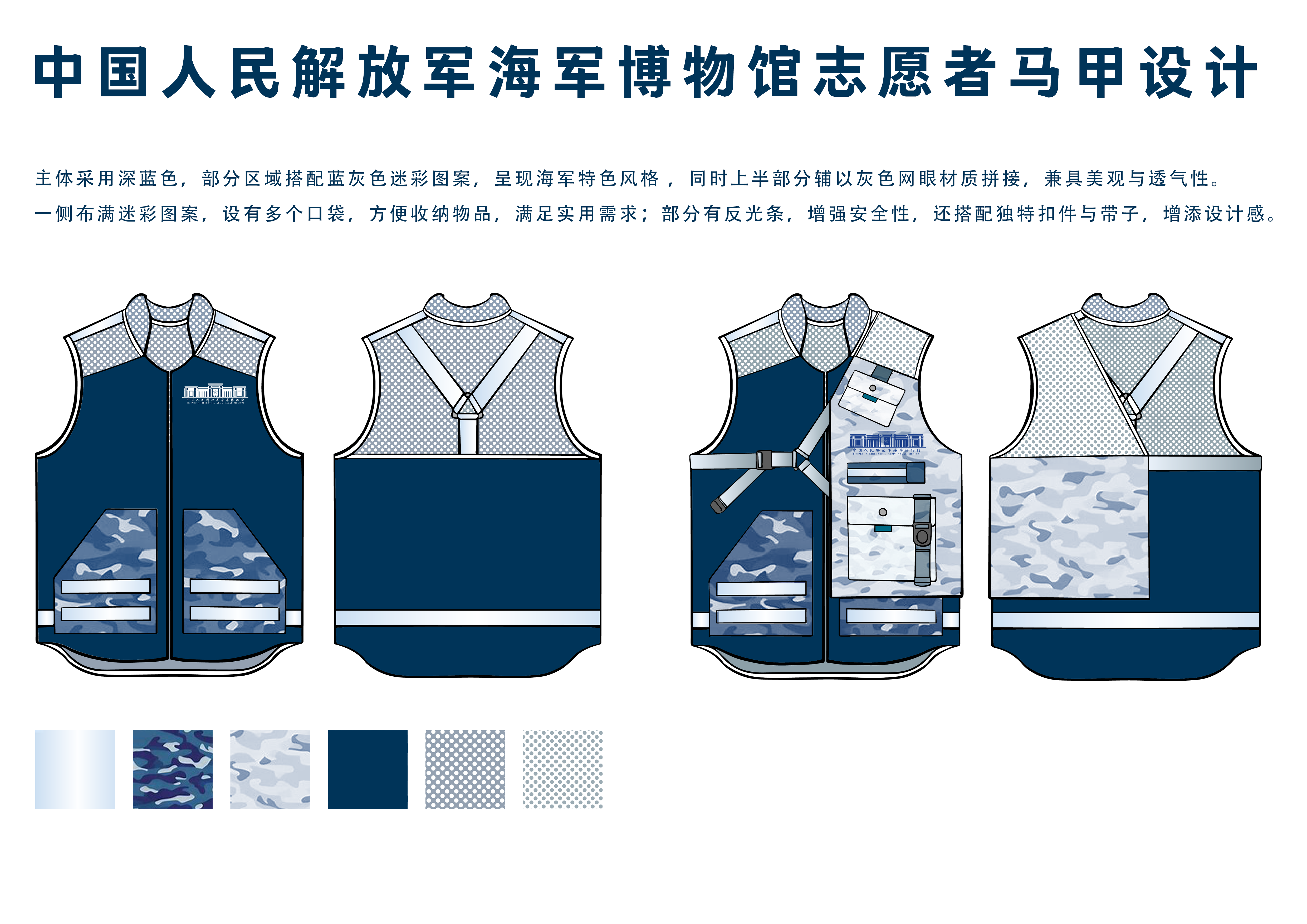 众多青年学生的积极参与,同学们凭借扎实的专业素养,将内心对人民海军的崇高敬意融入创意,与海军文化深度交融,精心勾勒出一件件饱含深情的志愿者马甲。在设计作品中,海军元素十分亮眼,每个细节都传递着对人民海军的无限敬意。有的用海军经典蓝白色调,配上象征海洋力量的波浪线条;有的巧妙把海军军旗、军舰等标志性元素融入图案,极具视觉冲击力,尽显海军文化内涵。