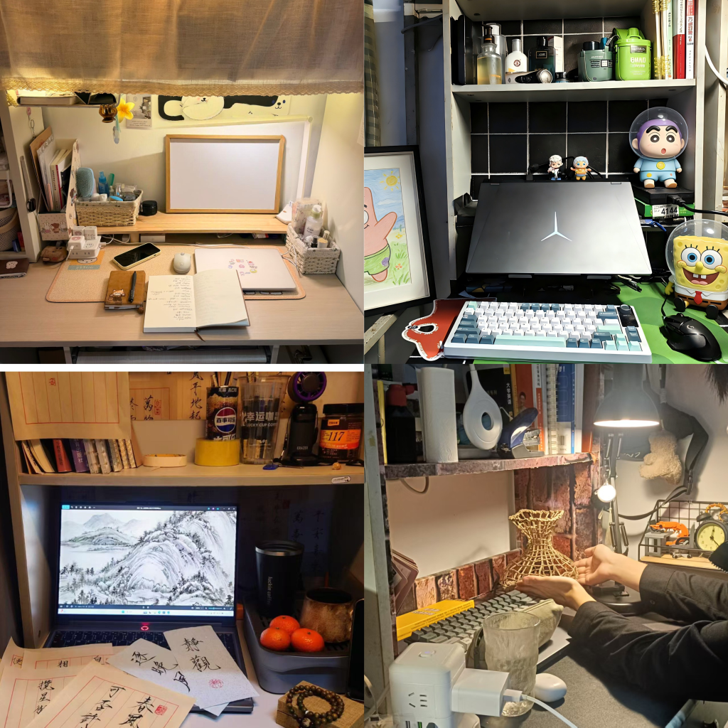 视觉传达设计、环境设计、产品设计等核心专业优势,重点围绕公寓公共空间美化与宿舍内部布置两大板块展开。在各公寓楼大厅、走廊、活动室等公共区域,学生们化身“空间设计师”,将专业所学转化为实践成果:有的宿舍以“传统美学”为主题,将书法、剪纸、等作品融入桌面,打造出古雅清幽的居住环境;有的宿舍聚焦“现代设计”,用手绘作品、玩偶模型装点空间,彰显时尚活力;还有的宿舍结合专业学习需求,设置了小型手绘区、模型展示角,让宿舍既成为生活港湾,也成为专业实践的“微工作室”。