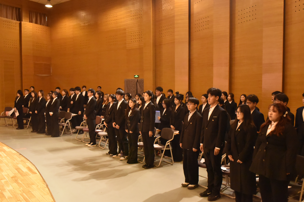 宣读《艺术学2025-2026学年“青马工程”实施方案》,从培养目标、课程体系、实践安排、考核机制等方面进行详细解读,明确本次培训将采用“理论学习+实践锻炼+榜样引领”的三维培养模式,助力学员全面成长。在全场师生的共同见证下,全体青马学员进行庄严宣誓。“坚定理想信念,传承红色基因,讲好科大故事,传播时代强音,勇担骨干使命,服务师生集体,努力成长为有理想、敢担当、能吃苦、肯奋斗的新时代青年!”铿锵有力的誓言回荡在报告厅内,既是学员们对青春的承诺,更是对责任的担当。