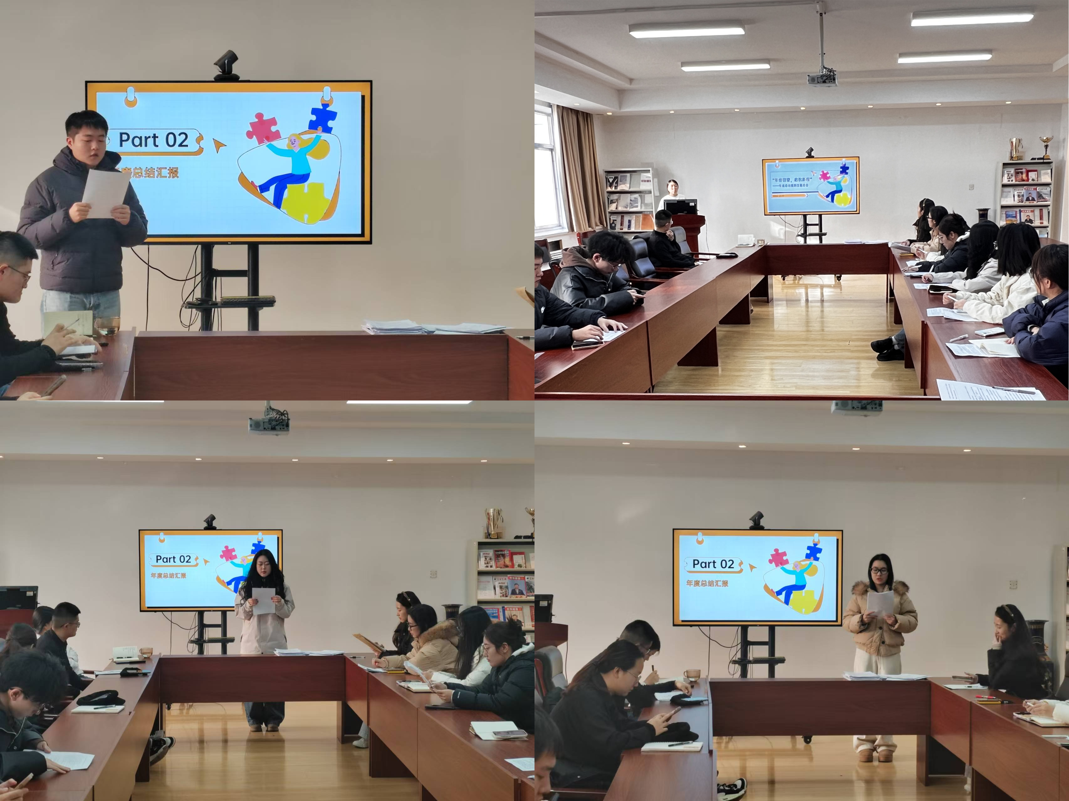 会上,辅导员宋晨曦带领同学们回顾了从新生入学季到期末以来共同经历的点滴和成长历程,同学们从刚入学的新奇、迷茫慢慢沉淀下来,找到自己的方向。同学们一一上台进行年度总结汇报,分享入学以来的成长故事,畅谈来年在班级工作和个人成长方面的目标规划。最后,宋晨曦对参会的学生干部进行了工作能力提升培训,传授文稿写作经验、明确班级工作重点难点,鼓励学生干部在做好工作的同时积极提升自我。