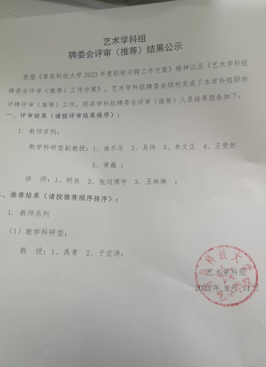 2023年艺术学科组聘委会评审结果公示