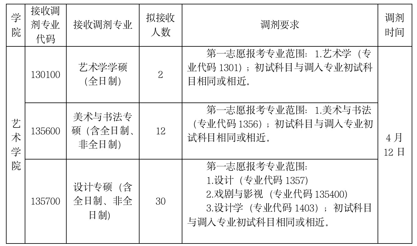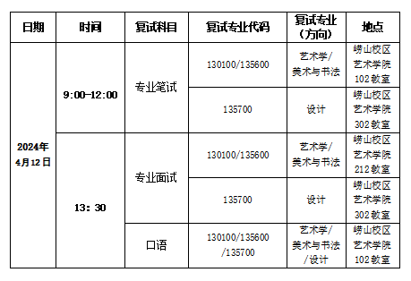 2、调剂复试专业笔试:时间3小时,满分为100分。艺术学(美术与书法史论方向)笔试形式为中外美术作品分析,艺术学(设计史论方向)笔试形式为设计作品分析;美术与书法(专硕)、设计(专硕)笔试形式为分方向(02景观设计与公共艺术、03服装设计与创意产品)的命题创作(设计);画纸规格为国画纸四尺斗方(68*68厘米),油画布60*80cm,设计手绘图纸4开;画纸以外的绘画材料工具需考生自备。