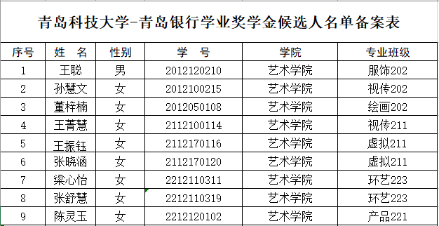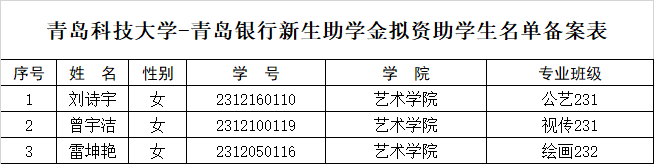 根据星际娱乐城 《关于评审2023年度青岛银行奖助学金的通知》的精神,经个人申请、材料初审、民主评议等环节,现就星际娱乐城 青岛银行奖助学金拟推荐名单进行公示,公示时间2024年4月30日-2024年5月7日。