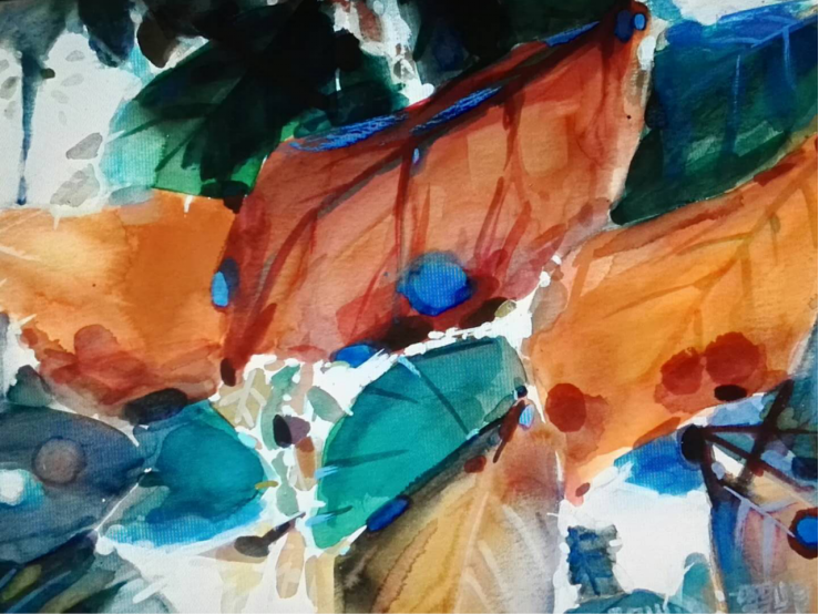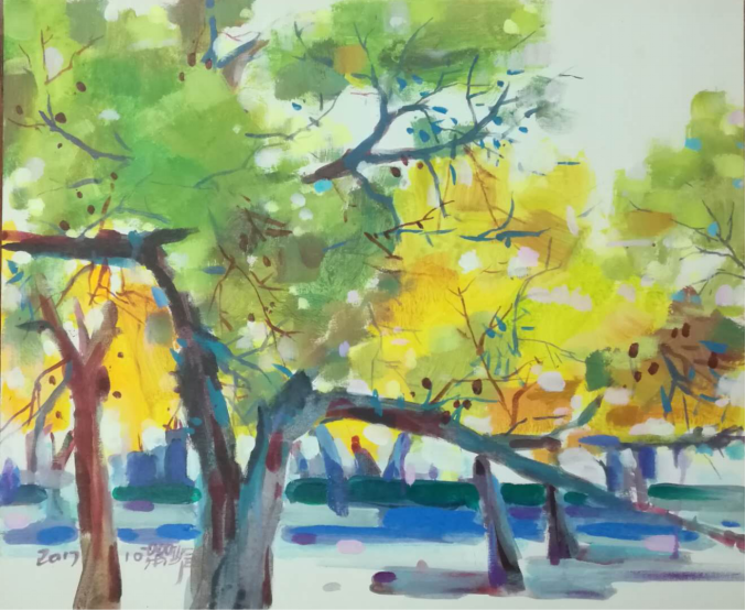 2009--2010年水彩《阳光下的树叶》绘画系列2001—2008年完成青岛三生缘文化艺术展览馆、青岛小绍兴餐饮有限公司、天府老妈、哥弟服装、书院商城、北方国贸第一商城等环艺设计及文化体系建设