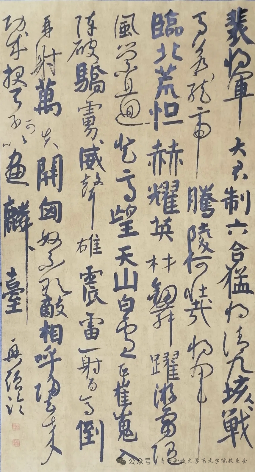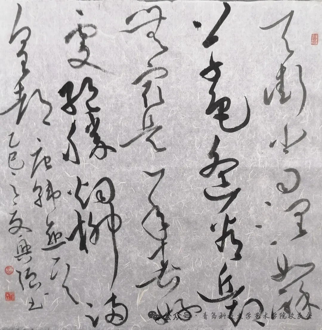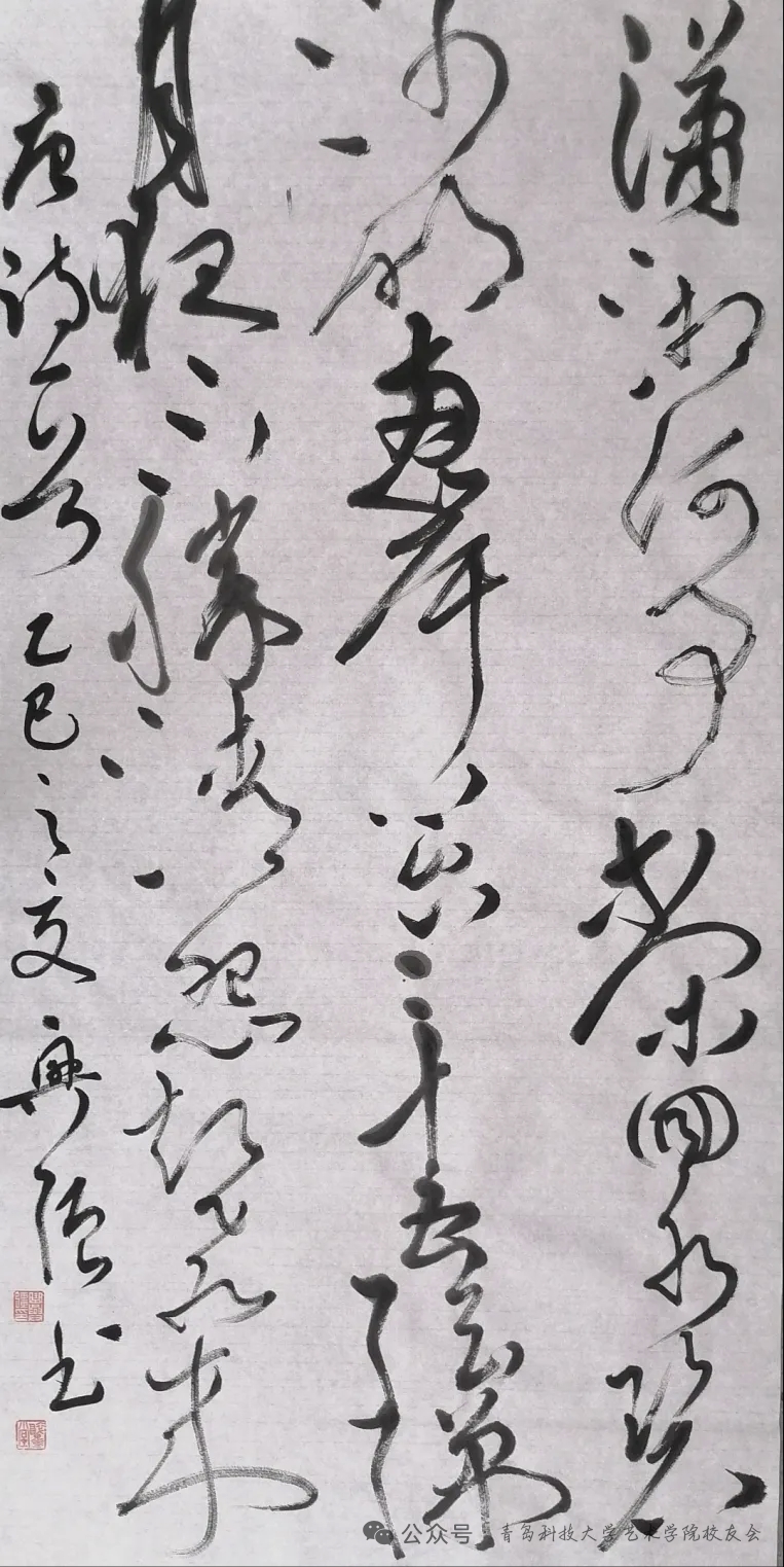 其书法创作,更是将“妙机其微”展现得淋漓尽致。他主攻草书,深谙“达其情性,形其哀乐”的精髓。展卷观之,飞舞的线条似有生命,时而如惊涛拍岸,汹涌澎湃;时而似小桥流水,温婉细腻。这些看似肆意奔放的笔触,实则暗藏玄机:每一处转折、每一笔牵丝,都经过深思熟虑与反复锤炼。他巧妙融合楷书的端庄严谨、隶书的古朴厚重,在狂放与规矩间寻得精妙平衡。提笔落墨间,他敏锐捕捉笔墨与纸张接触的瞬间变化,依心境与节奏赋予线条丰富层次——墨色浓淡交织,恰似阴阳流转;线条粗细变化,宛若四季更迭。观者在笔墨游走间,能真切感受到他对艺术精微之处的精准把握。